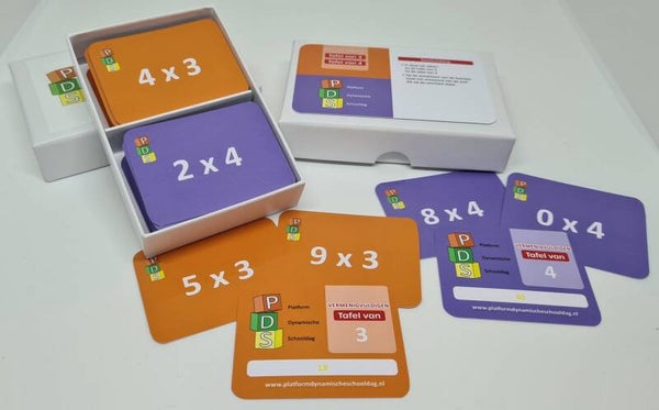 In deze boxen zitten alle niveaus in een doorgaande lijn. Binnen deze box is dit de doorgaande lijn met betrekking tot het vermenigvuldigen. De tafels van 1 t/m 15, 20, 25, 50, 100, 0,5 én 0,25 zitten in deze box. De antwoorden van de vermenigvuldigingen staan op de achterkant. Bij de tafels van 0,5 en 0,25, staan daarop ook de bijbehorende delingen. Dit maakt dat de leerlingen middels zelfcontrole verschillende type opdrachten uit kunnen voeren met desbetreffende kaartjes.