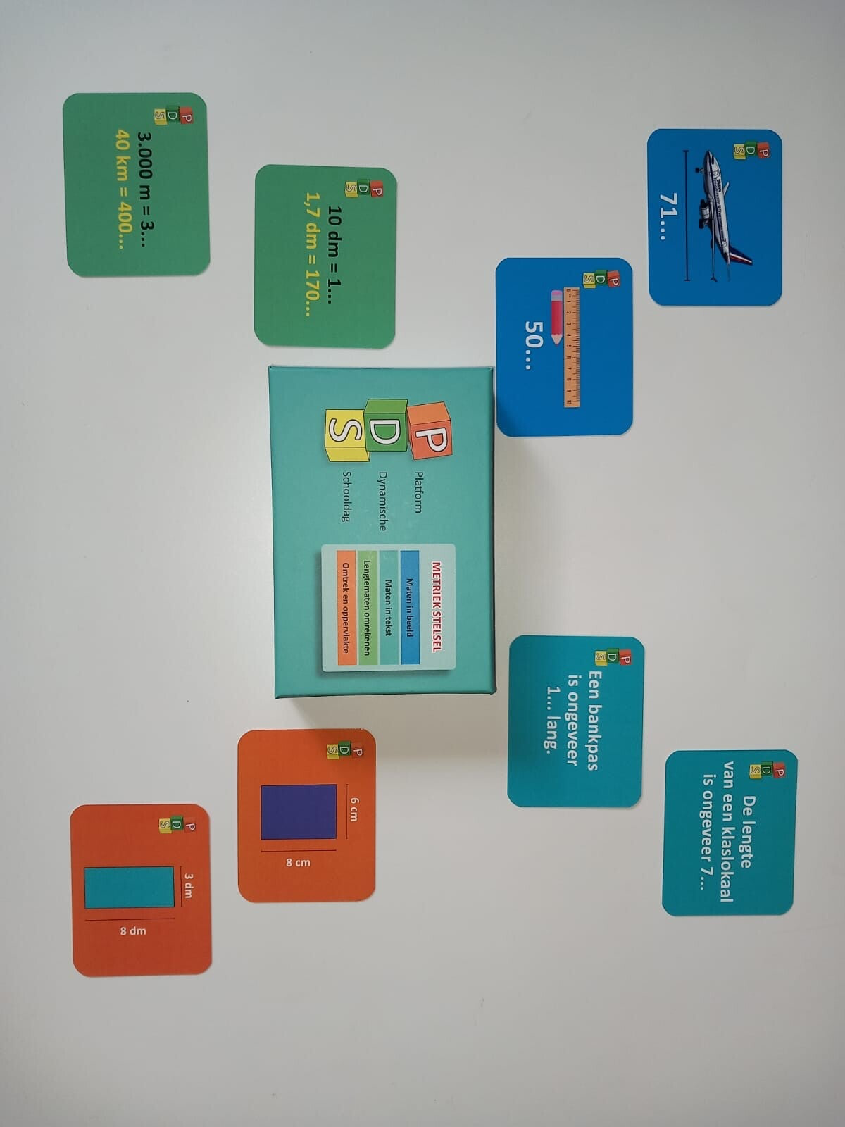 In dit doosje zitten 125 kaartjes met daarbij verschillende vormen om het metriek stelsel te oefenen.